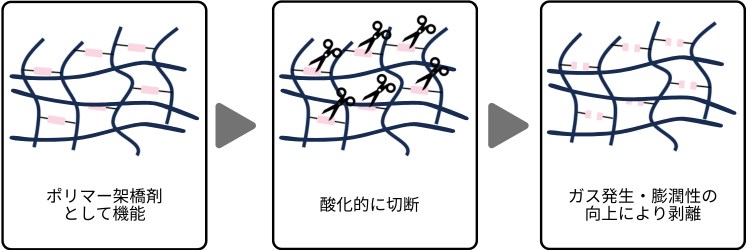 高耐熱かつ酸化分解性能を有する新規架橋剤です。各種ビニル・アクリル系モノマーと共重合することにより、架橋構造を有するポリマーを得ることができます。塩素系酸化剤と反応して、ポリマー中の架橋部位を切断することができます。任意のタイミングでの分解が可能であるため、易解体接着剤などへの適用が想定される材料です。