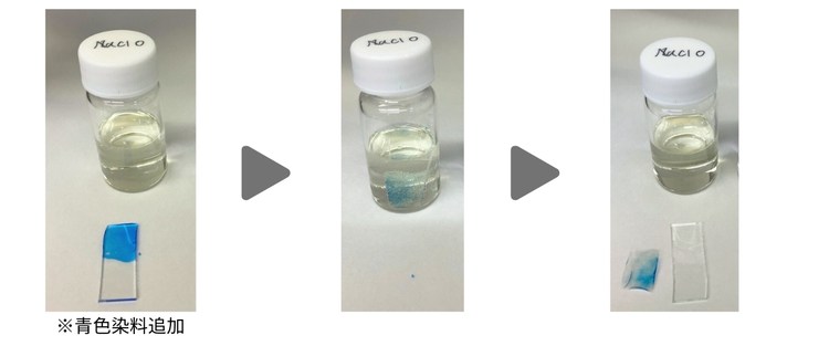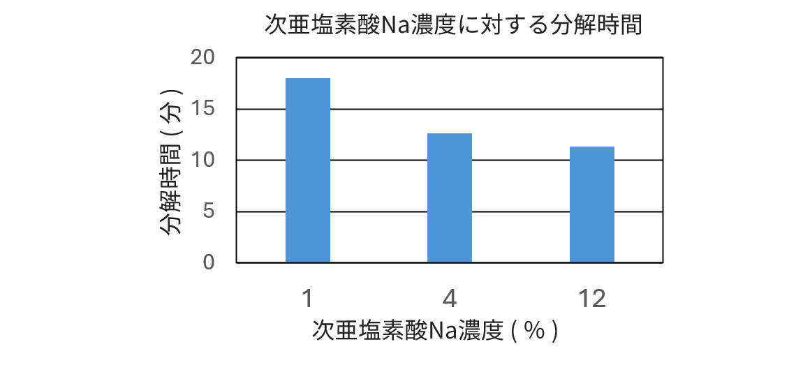 ②各濃度の次亜塩素酸Na水溶液に浸漬させ、分解するまでの時間を計測