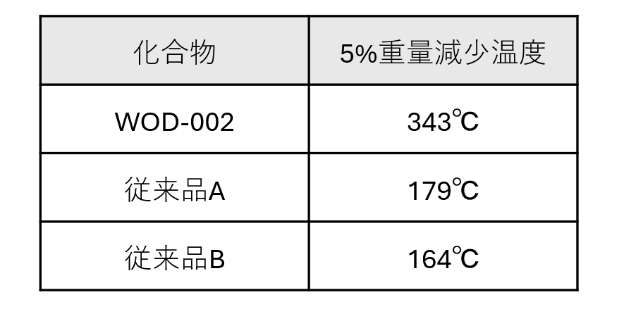 化合物の5 %重量減少温度を測定したところ、ヒドラジド構造を有する他の架橋剤と比較して、分解温度が大きく上回りました。